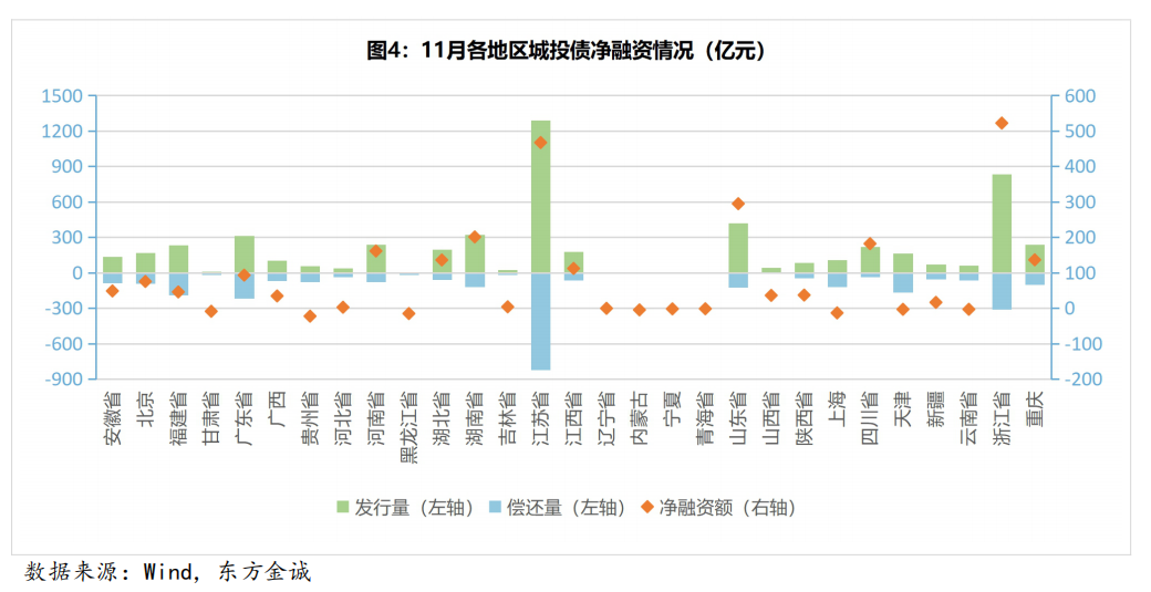 从区域分布看,11月江苏和浙江城投的发行量、偿还量,以及净融资额等各维度规模均位于所有省份的前两位,融资活跃度较上月显著提升。其中,浙江省11月净融资521.74亿元,位居所有省份第一,净融资量环比提高127.67%;江苏省11月发行规模环比大幅增加520.71亿元,增幅67.75%;净融资466.85亿元,环比上升829.61%,或释放了部分前期积压的融资需求。另外,11月共有10个省份净融资为负值,不过从数据来看,净偿还规模很小,净偿还最高额的贵州省22.92亿元,这与募集资金投向主要为借新还旧相符。