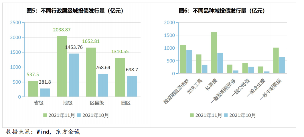 从行政级别看,11月,地市级城投债券发行量在全部城投类型中仍居首位,但规模占比由10月的45.39%下滑8.59个百分点至36.80%。区县级城投债券发行占比环比提升5.84个百分点至29.84%,主要是江苏和浙江两省的区县平台发行增加所致。