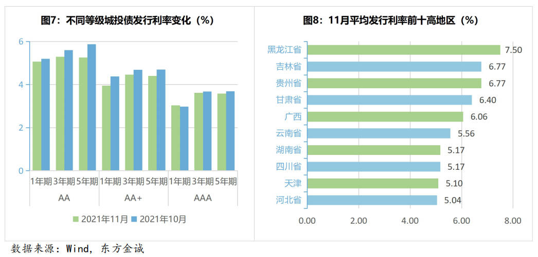 从发行成本看,11月城投债加权平均票面利率为4.21%,环比提升3个基点,整体波动不大。分主体等级和债券期限看,除1年期AAA级城投债平均发行利率小幅提高外,其余各期限、各等级发行票面利率均有所回落。若以考虑回售等因素的调整后期限来看,1年期AAA级城投债也是唯一平均票面上涨的类别,其平均利率由10月的2.98%升至11月的3.04%。另外,11月发行的各等级城投债中,中长期限发行利率较1年期的下行幅度更大。