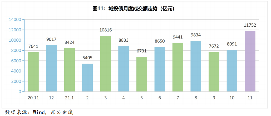 11月,城投债交易活跃度显著回暖,当月交易额约11751.79亿元,同比大幅提升53.81%,较10月亦明显增加45.24%,创年内新高。近期地产债风险持续加大影响下,投资者更加青睐城投债,或是带动城投债成交活跃的主要原因之一。