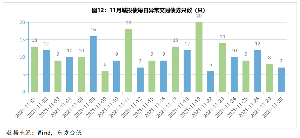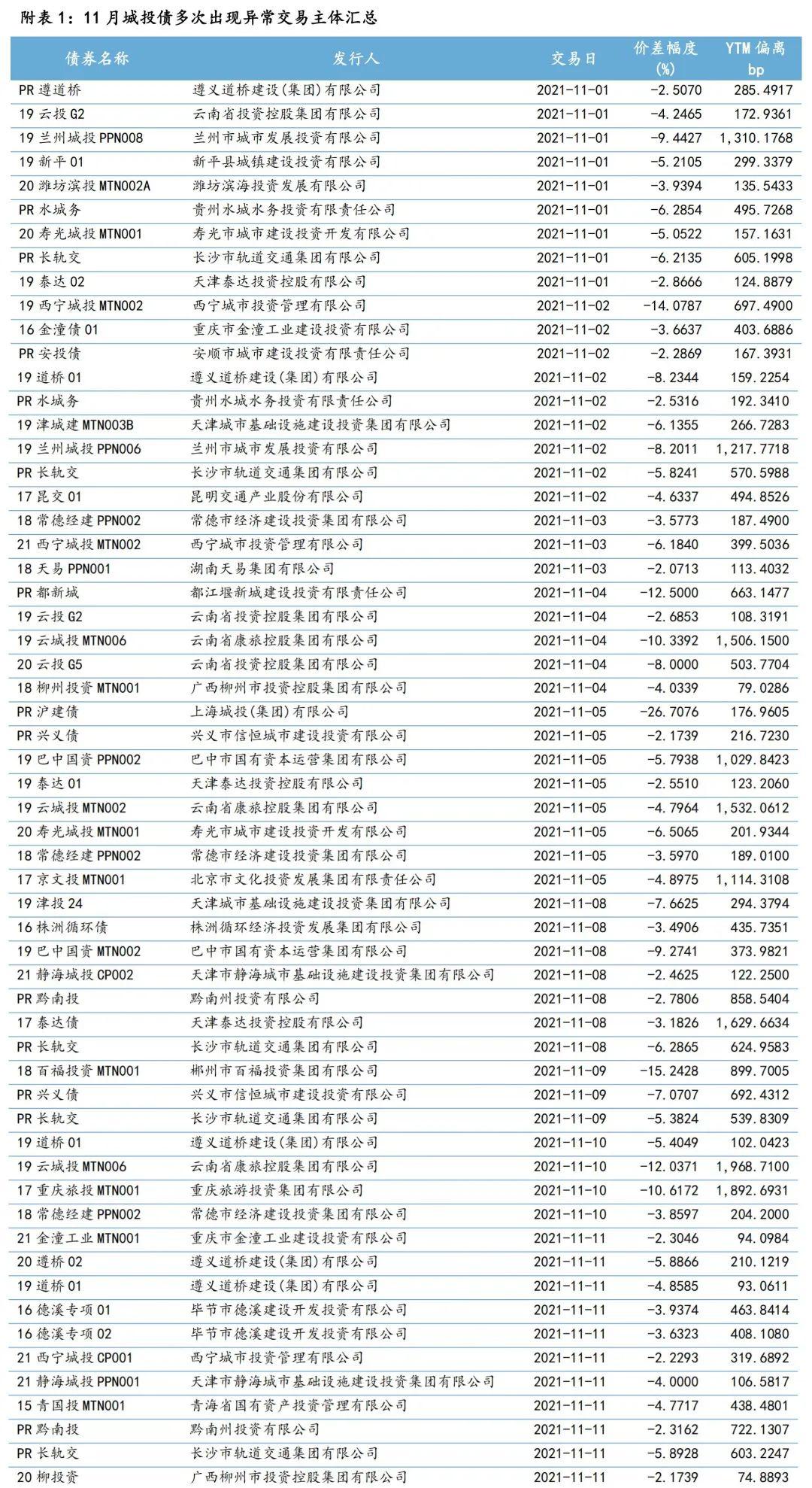 异常交易方面,11月共有131家城投公司主体的债券出现异常交易2,其中40家城投公司多日出现交易价格异动,较上月显著增加一倍。长沙轨道交通、兰州城市发展、遵义道桥,以及云南康旅涉及的异常交易日分别达到12天、10天、8天和7天(详见附表1)。
