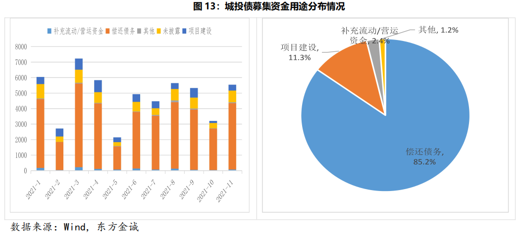 受监管政策、债务滚续需求和地方基建投资支出较慢等因素影响,城投债募集资金绝大多数用于偿还债务,用于项目建设的资金有限,削弱了城投公司在地方基建领域的投资能力。考虑明年到期债务的规模,预计募集资金用途为偿还债务的占比依然会较高。但另一方面,中央经济工作会议强调2022年财政政策发力适当靠前,为满足稳经济等需求,明年基建投资规模或有所加大,用于项目建设的债券融资规模占比或将有所提升。