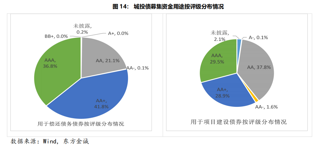 从主体评级看,用于偿还债务的债券中AA+占比最高,AAA次之,占比分别为41.8%和36.8%;用于项目建设的债券中AA占比最高,为37.8%,AAA和AA+的占比均在29%左右;用于补充流动或营运资金的债券中AAA占比为82.7%,显著高于其他等级债券。