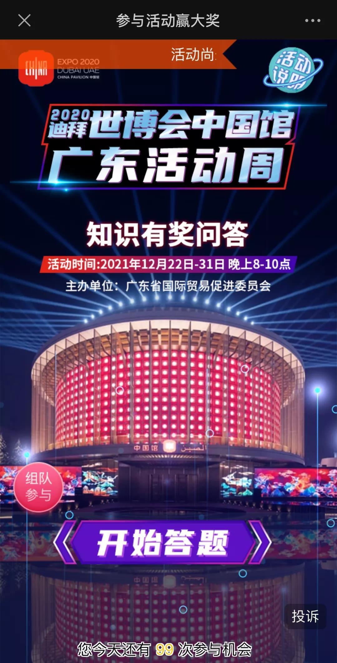 为帮助大家了解世博会历史,知悉中国、广东与世博会的深厚渊源,获取迪拜世博会中国馆广东周丰富多彩的活动安排,广东省贸促会微信公众平台“广东贸促”将于12月22日-31日期间,每晚8-10点上线世博知识有奖问答活动——欢迎小伙伴们积极踊跃参与,答题赢奖金、抽奖品!
