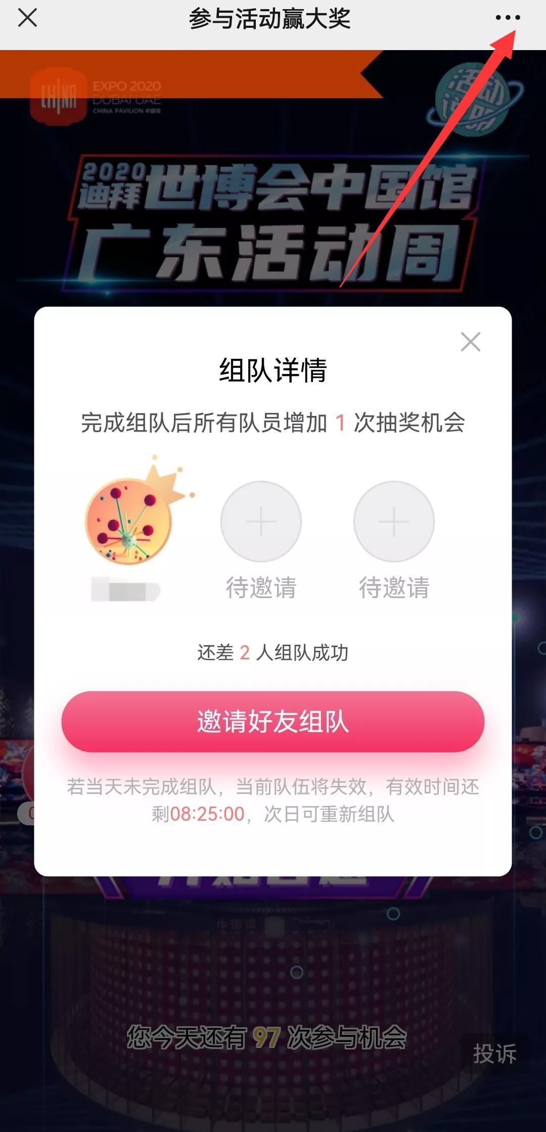 点击红色【邀请好友组队】按钮后,再点击右上方... 分享链接,召集好友,进行组队!