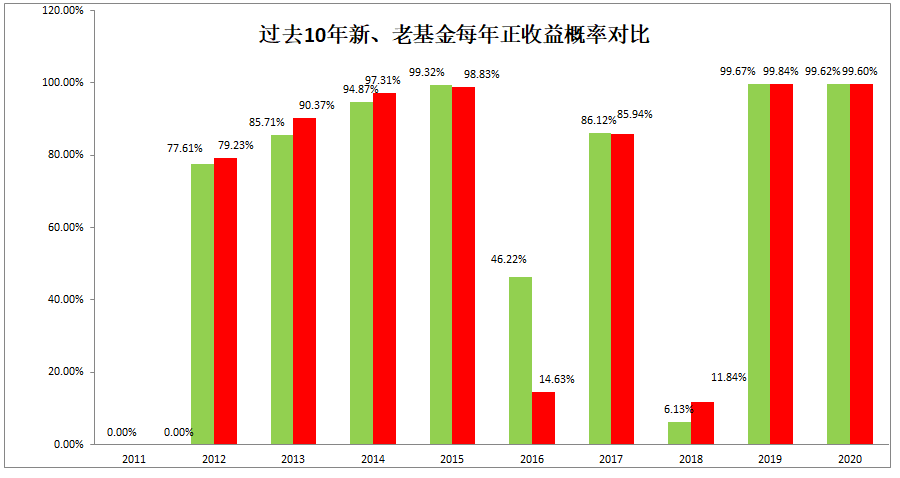 结论:老基金胜。除了2016年外,老基金均以微弱优势胜出,在10年中的9年时间里,老基金赚钱概率都要比新基金平均高1.8%。
