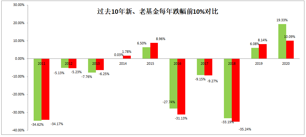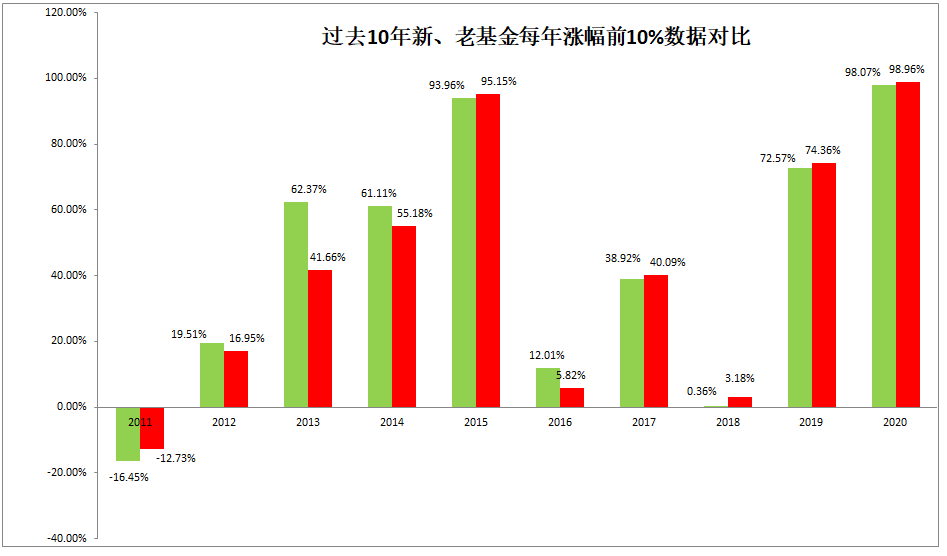 1.10年时间中,排名前10%的老基金有6年涨幅领先,而排名前10%的新基金有4年涨幅领先,老基金略胜一筹。