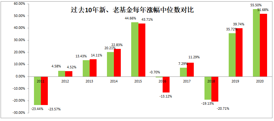 接下来,我们就以全市场所有主动权益基金为统计对象,以成立时间1年差距为新老基金区分点,近10年(2011-2020)为统计时间,来看看到底是老基金赚钱还是新基金赚钱。