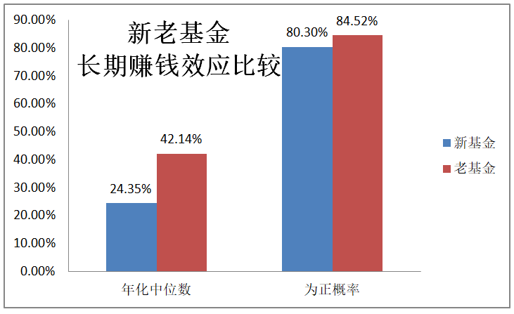 由于在规则设置上,新老基金的成立时间刚好岔开一年,因此,我们的统计结果发生了特别明显的差异,那就是老基金的业绩和赚钱概率均超过新基金,但这和新老基金本身的优劣无关,二者只是运营时间上存在差异而已。