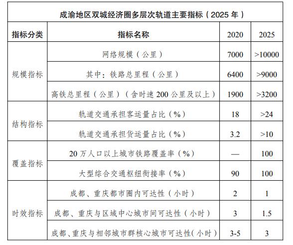 《规划》指出,到2025年,初步建成轨道上的成渝地区双城经济圈,进出川渝四向通道基本形成,形成功能清晰、布局合理的设施“一张网”,点线协调、衔接高效的枢纽“零换乘”,客货并重、联程联运的运输“一体化”。轨道交通总规模达到1万公里以上,其中铁路网规模达到9000公里以上、覆盖全部20万以上人口城市,形成重庆、成都都市圈1小时通勤圈,实现重庆、成都“双核”间1小时通达,“双核”与成渝地区区域中心、主要节点城市1.5小时通达,与主要相邻城市群核心城市约3小时通达。大宗货物年运量150万吨以上的大型工矿企业、新建物流园区铁路专用线力争接入比例达到85%,长江干流主要港口实现铁路进港。轨道交通承担客运量、货运量占比大幅提升,有力支撑沿江货运通道、中欧班列、西部陆海新通道高质量发展。