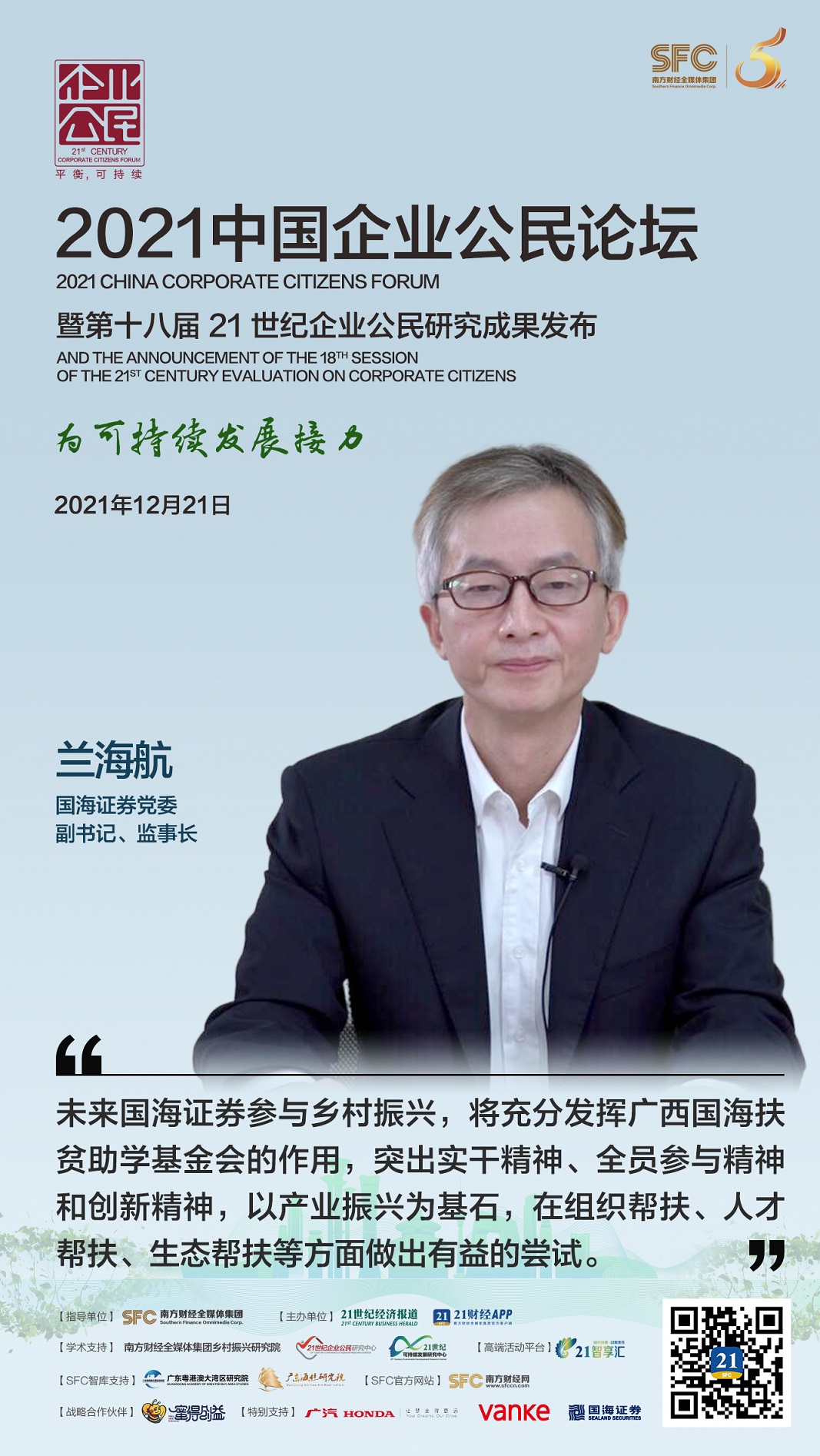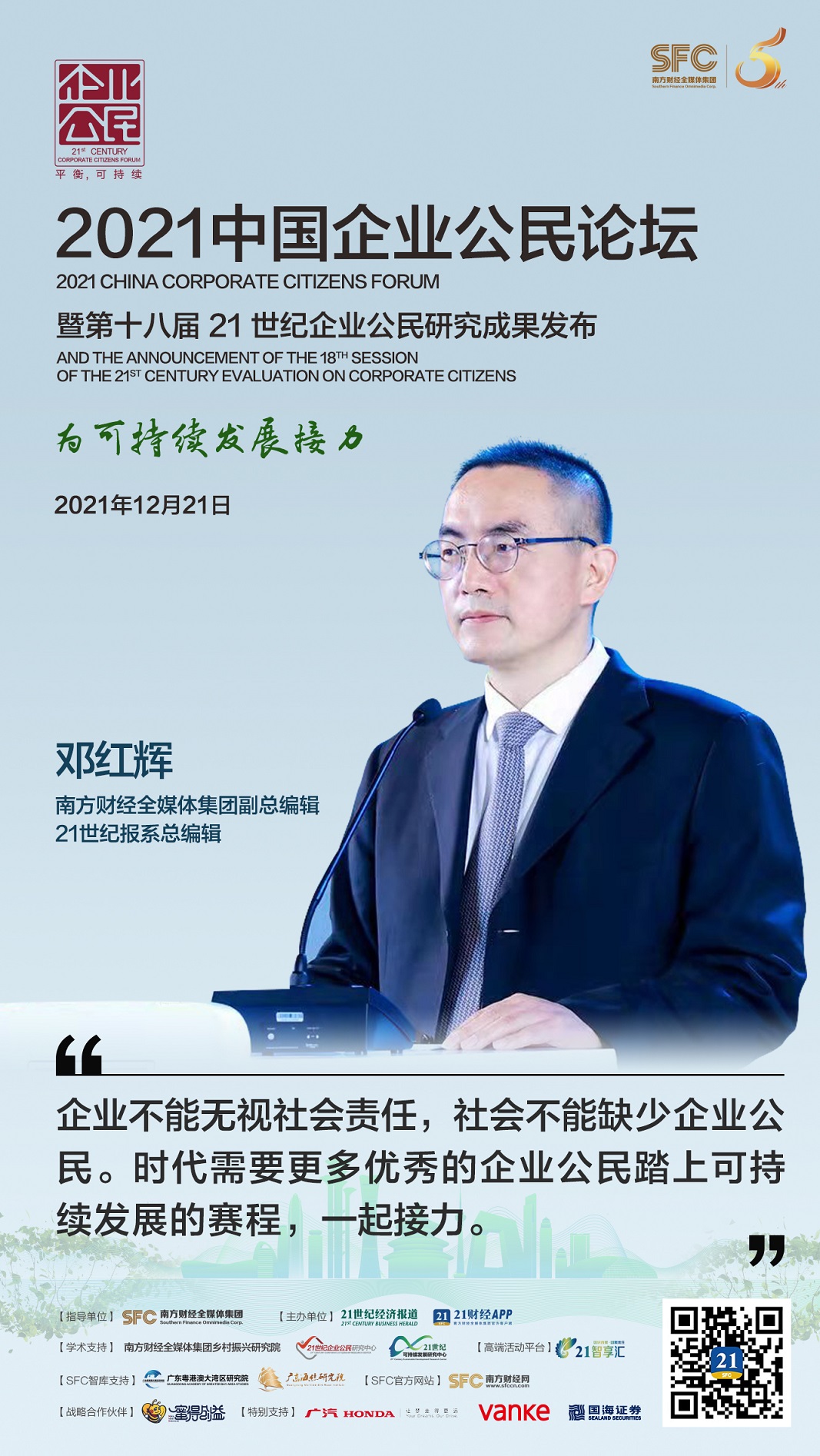 作为CSR/ESG领域一年一度的盛会,由数字化智库型财经媒体领跑者《21世纪经济报道》主办的“2021中国企业公民论坛暨第十八届21世纪企业公民研究成果发布”于2021年12月21日以在线的方式顺利举办。本届论坛以“为可持续发展接力”为主题,邀请来自CSR/ESG领域专家学者、公益伙伴、先锋企业和优秀CSR项目代表,就可持续发展、碳中和、环境信息披露、乡村振兴等议题进行了深入的对话交流。本论坛连续举办18载,见证了中国可持续发展和CSR/ESG事业持续前行的非凡历程。