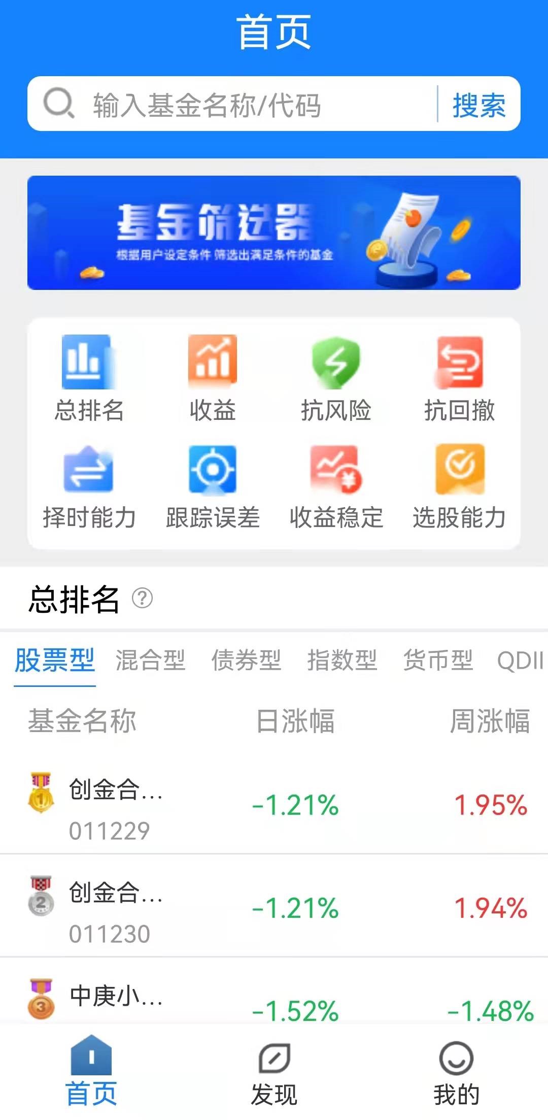 比如,在基金通APP中,我们通过“发现”功能,来选择相关基金。