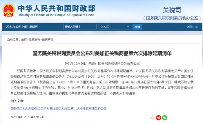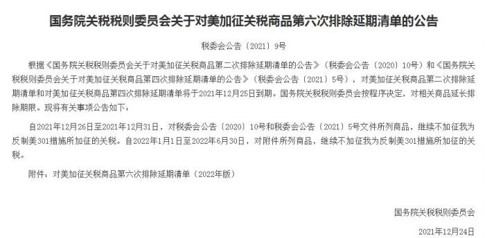 经国务院批准,国务院关税税则委员会公布对美加征关税商品第六次排除延期清单,对《国务院关税税则委员会关于对美加征关税商品第二次排除延期清单的公告》(税委会公告〔2020〕10号)和《国务院关税税则委员会关于对美加征关税商品第四次排除延期清单的公告》(税委会公告〔2021〕5号)中的相关商品,延长排除期限,自2021年12月26日至2022年6月30日,继续不加征我为反制美301措施所加征的关税。其中,自2022年1月1日起,第六次排除延期清单根据2022年进出口税则实施。鉴于我国法律法规禁止放射性废物输入境内,由单独的税则号列具体列名的放射性残渣,不再列入排除清单。
