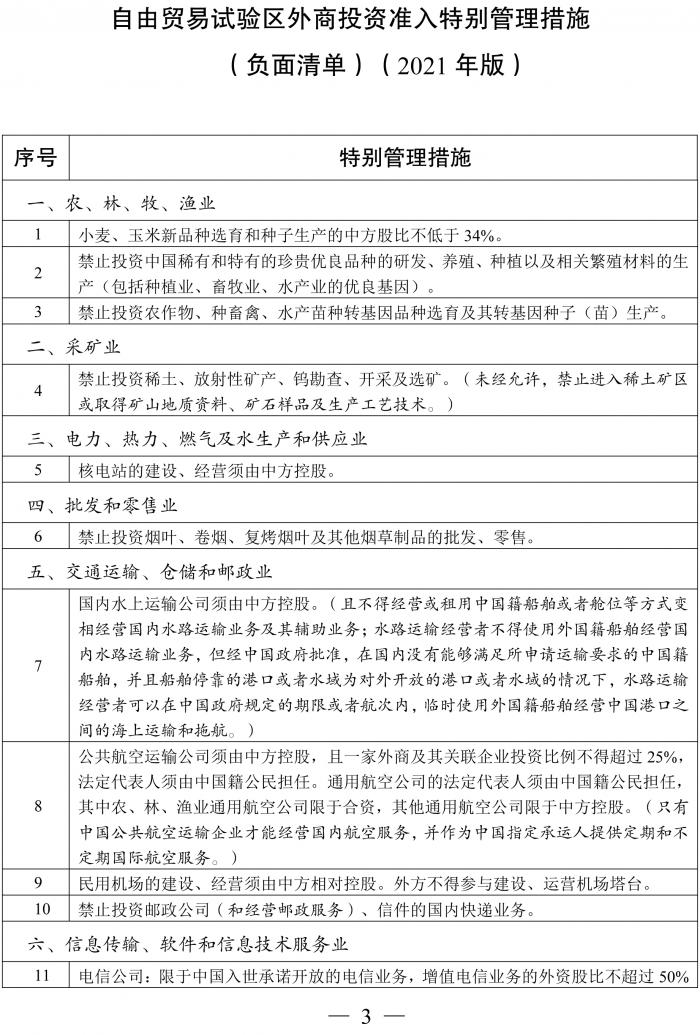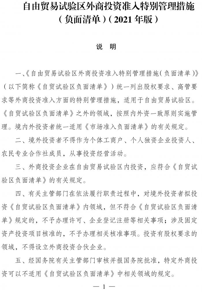 《自由贸易试验区外商投资准入特别管理措施(负面清单)(2021年版)》发布