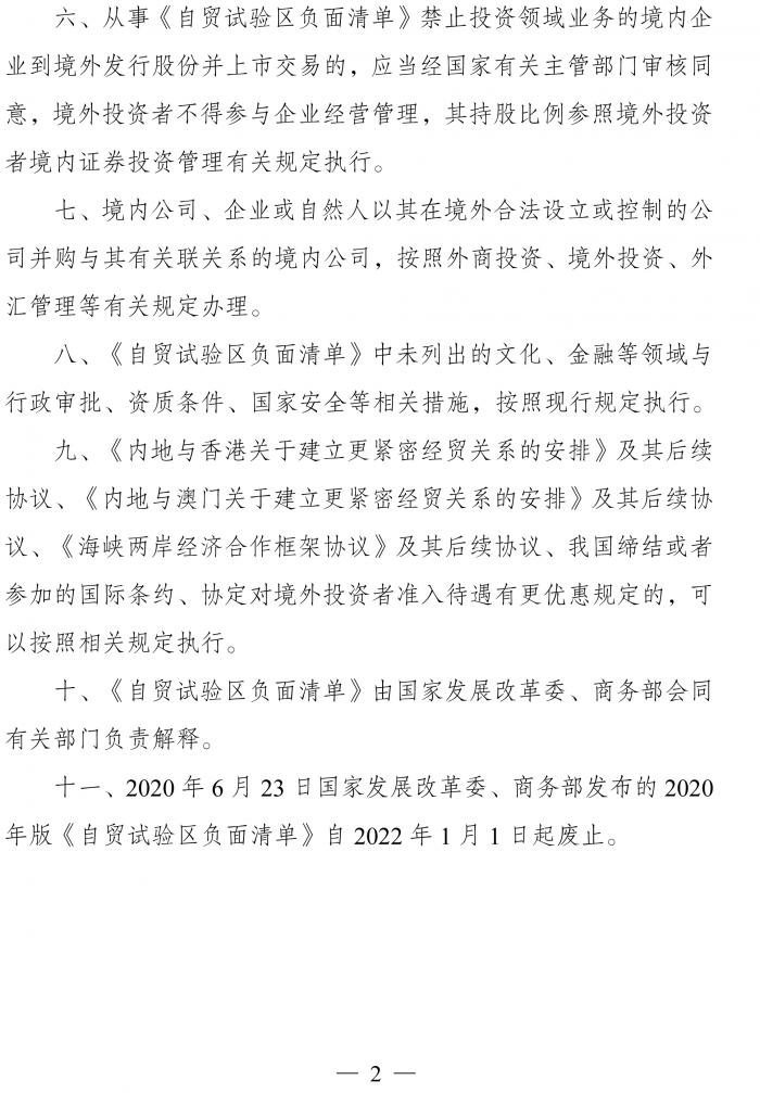 12月27日发改委消息,《自由贸易试验区外商投资准入特别管理措施(负面清单)(2021年版)》已经2021年9月18日国家发展和改革委员会第18次委务会议审议通过和商务部审签,并经党中央、国务院同意,现予以发布,自2022年1月1日起施行。