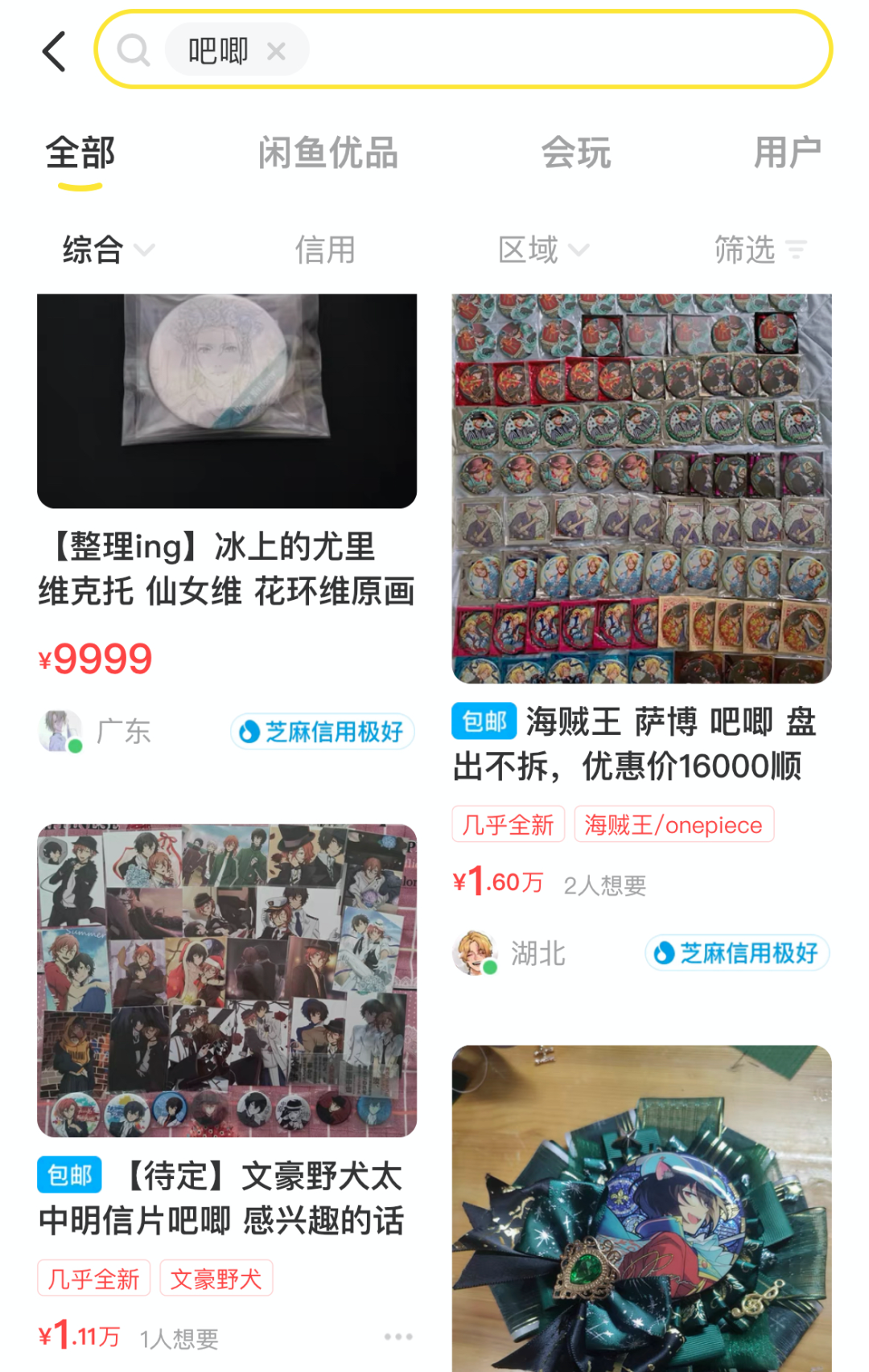 而我们在咸鱼上搜索谷圈的关键词“吧唧”,也能看到一些完整的set,可以卖到上万。