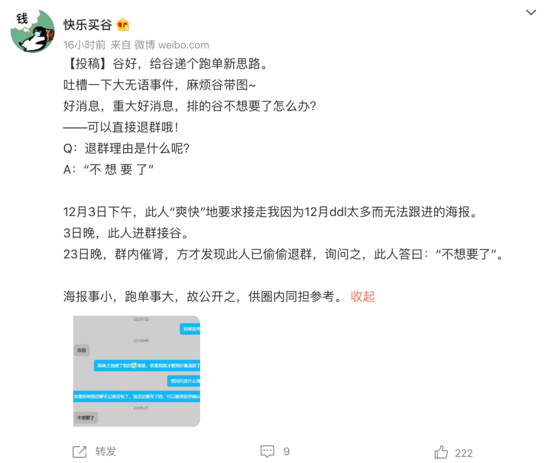 同样,随之兴起的二手交易市场也常常出现问题,比如微博@快乐买谷 作为该小众圈子的KOL,就会常常帮助网友们“挂人”,避免购买谷子时上当受骗。