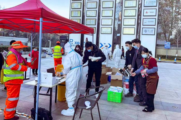 广发银行西安分行大楼门前广场是高新区第二轮核酸检测点位之一,该行坚持以人为本的理念,为检测点工作人员提供了水饺、酸奶、水果、热水等餐食,让最美“逆行者”抵御严寒,感受“广发温度”。