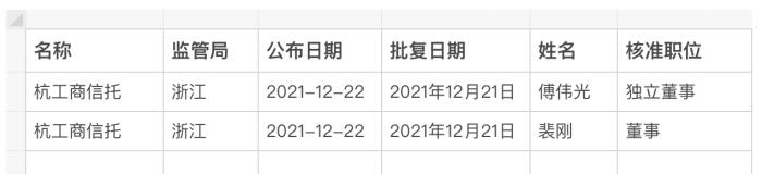 上周,以银保监官网公布日期为口径,仅有杭工商信托的董高监任职资格获批,包括独立董事傅伟光、董事裴刚。
