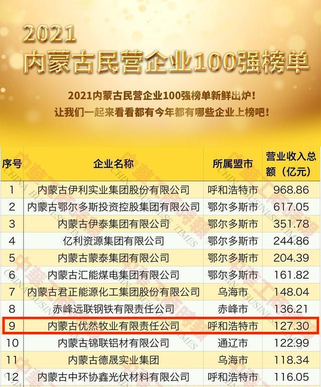 12月24日,内蒙古民营企业100强由内蒙古自治区工商业联合会发布,上榜的100家企业涵盖食品、制造、能源、化工和农牧等行业,该榜单按照企业营业收入进行排名,其中优然牧业以127.3亿元(按照中国企业会计准则)的营业收入总额排名升至榜单第9名,较2020年提升了4名。