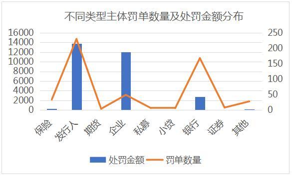 从被处罚主体看,银行共收168张罚单,合计金额为2752.13万元;保险机构合计收34张罚单,合计被罚款315.7万元;证券业(含证券/基金/基金/资管等,下同)及证券发行人合计收249张罚单,合计被处罚1.39亿元。