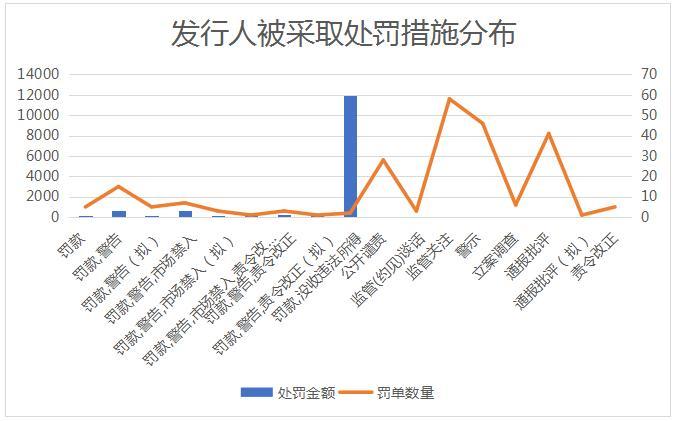 上周发行人被采取最多的监管处罚措施依旧为监管关注,共有58张罚单,其次是警示,共有46张罚单,通报批评的罚单数量排第三,有41张罚单。