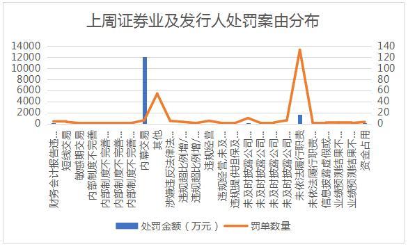 上周证券业及发行人被处罚最多的案由依然为未依法履行职责,有133张罚单,其次为未及时披露公司重大事件。