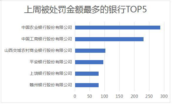 从银行机构处罚排名(含机构和个人)来看,上周领罚单数量最多的银行为工商银行,上周共收到13张罚单,其次为农业银行,罚单为11张。若以罚款金额来排序,合计罚款金额最多的为农业银行,上周合计被罚款287.21万元,工商银行合计被罚230.45万元排第二。山西交城农村商业银行股份有限公司合计被罚款102.5万元排第三。农业银行两张比较大的罚单一张来自于中国农业银行股份有限公司威海分行,因为其办理经常项目外汇收支业务,未按照规定审核交易单证的真实性及其与外汇收支的一致性,被国家外汇管理局威海市中心支局责令改正,并处以罚款60万元,没收违法所得2.05万元。还有一张来自于中国农业银行股份有限公司湖北省分行,因为其涉嫌违反账户管理相关规定,央行武汉分行对该行处警告,没收违法所得561901.79元,并处违法所得一倍的罚款。