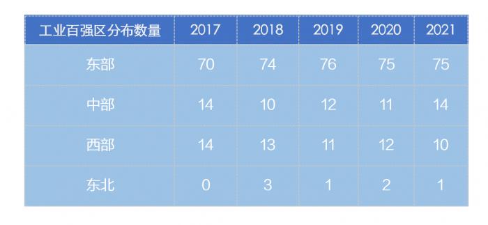 就区域分布而言,2021年百强区东部地区有75个,中部地区14个,西部地区10个,东北地区1个。