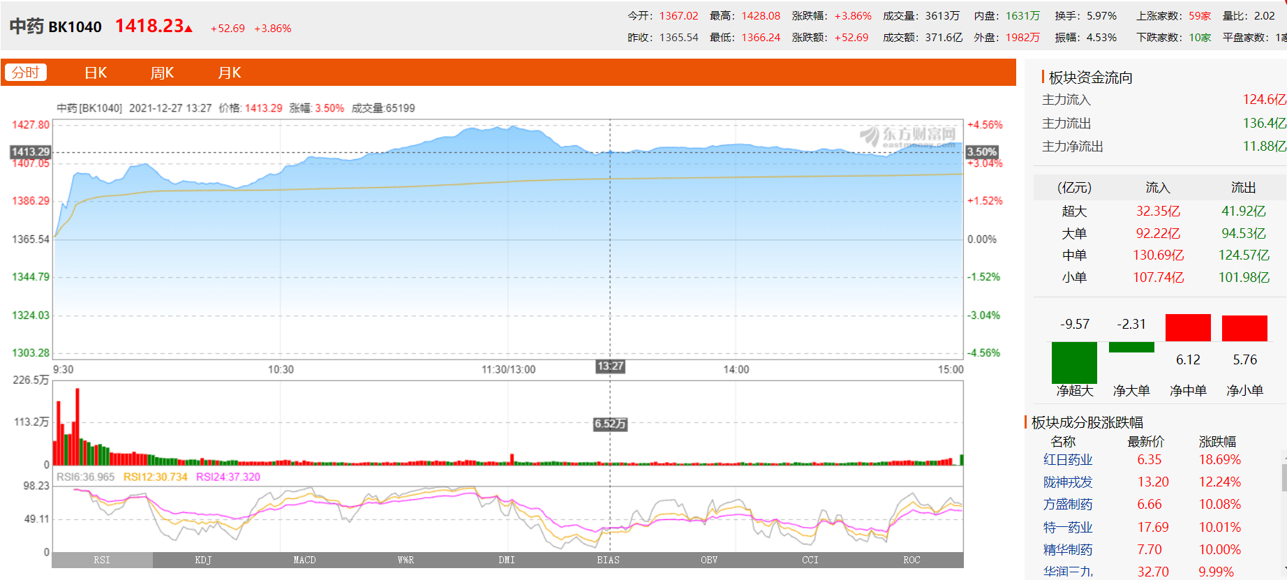 12月27日,中药板块延续上周热度大涨3.86%。在个股方面,红日药业、陇神戎发分别以18.69%、12.24%的涨幅领涨。此外,方盛制药、特一药业、精华制药、华润三九、龙津药业、佛慈制药、大理药业纷纷涨停。