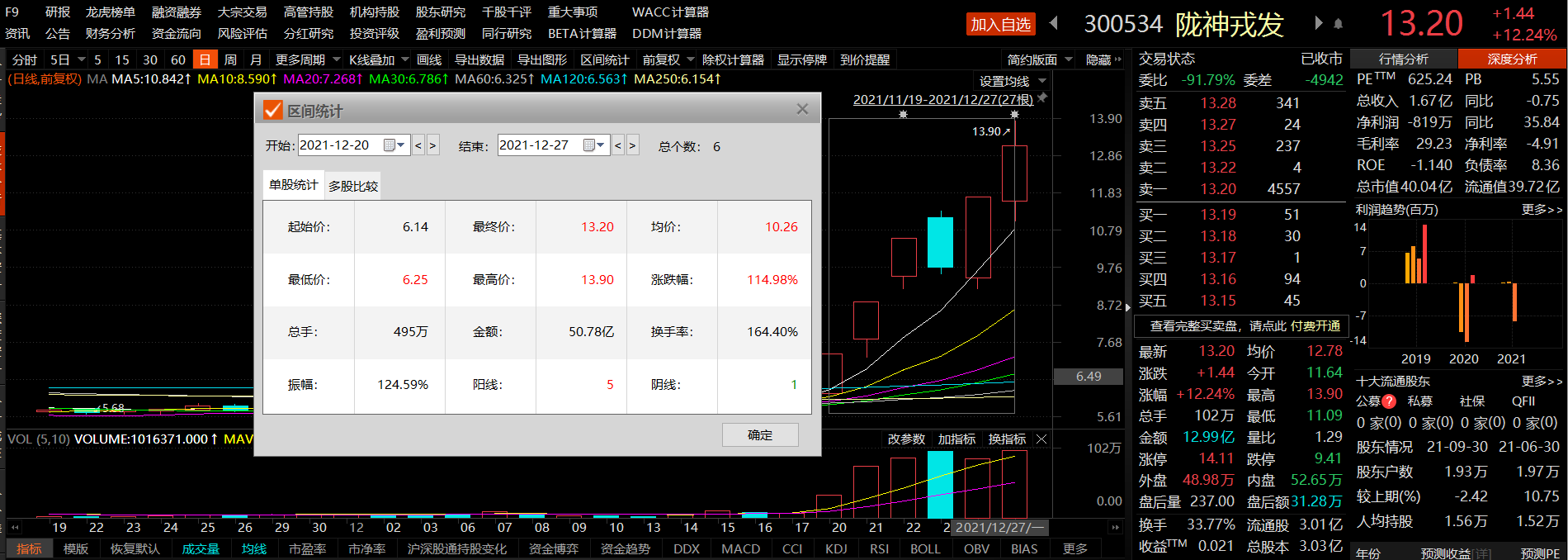 据《国际金融报》记者统计,陇神戎发在12月20日至12月27日这6个交易日内实现了高达114.98%的涨幅,股价实现翻倍。