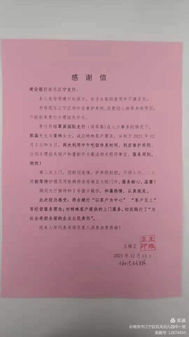 一封特殊的感谢信 :建行南京翠屏国际支行上门服务,情暖寒冬