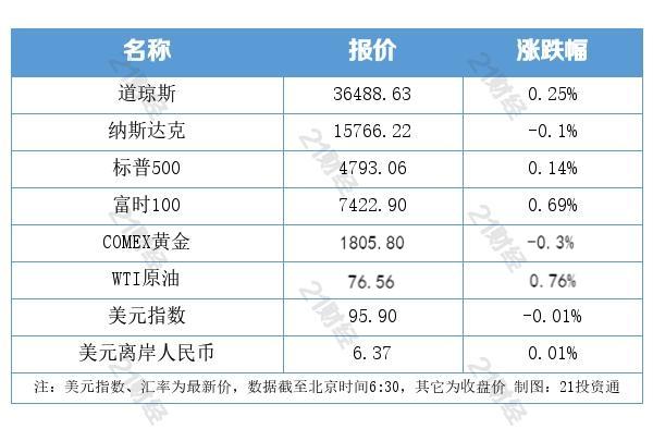 2、美股涨跌不一,道指涨0.25%,报36488.63点,连涨六日并创历史新高;标普500指数涨0.14%,报4793.06点,创收盘历史新高;纳指跌0.1%。