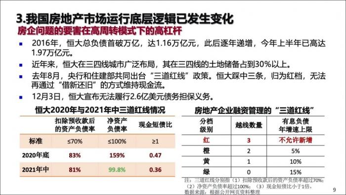 盛松成认为,我国房地产市场运行底层逻辑已发生变化。现在的房地产企业的高风险,已经引起了社会各界的广泛关注,房企问题的要害,在于高周转模式下的高杠杆。去年8月,央行和住建部共同出台了三道红线政策,意义在于抑制房地产企业高杠杆和盲目扩张。