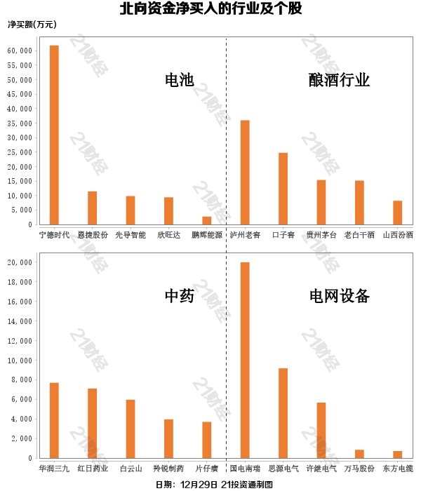 从净买入金额来看,北向资金增持了48个行业,其中电池居首,净买入金额达6.54亿元,其次是酿酒行业,净买入6.20亿元。