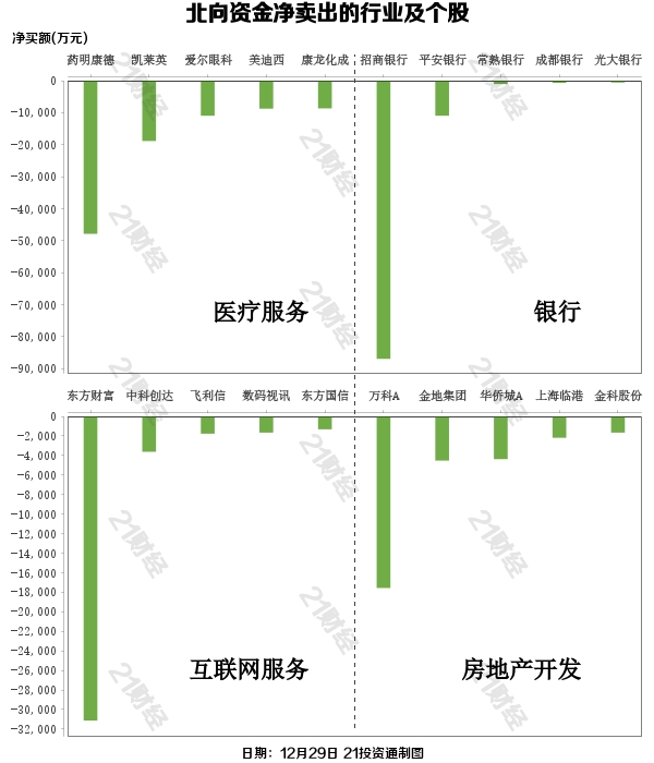 其中,招商银行被净卖出8.70亿元,药明康德被净卖出4.79亿元,东方财富被净卖出3.11亿元,洋河股份被净卖出2.10亿元,凯莱英被净卖出1.89亿元。
