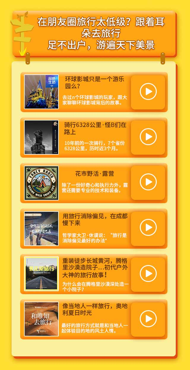 此外,荔枝精选6个旅行类节目,包括近期热点环球影城,足不出户的小耳朵也能跟着耳朵游天下。北京环球影城开业,让作为去过N个环球影城的玩家、主播津津乐道播客跟大家聊聊环球影城背后的故事、get到环球影城玩法精髓的攻略。