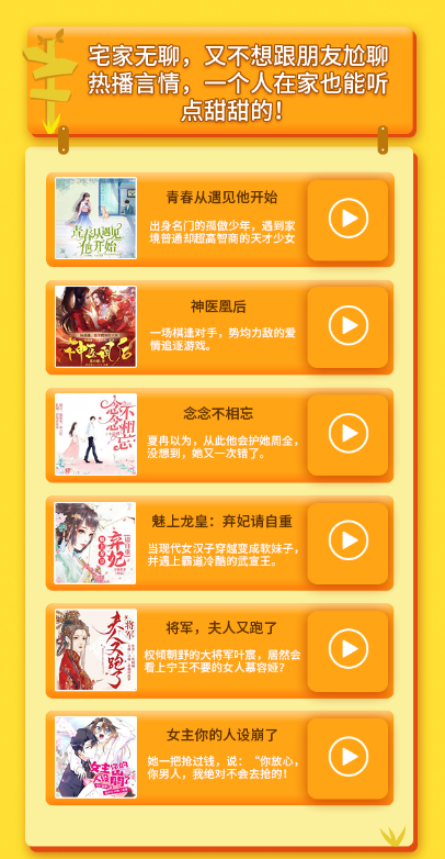 根据《2021中国网络视频发展研究报告》,六成用户睡前听,三成用户午休听,四成用户干家务听,安抚情感、人生成长的音频节目受到年轻人欢迎。情感类音频节目是荔枝App上活跃度最高的内容。此次国庆热门播单也精选了6个系列的热播言情小说,包括《青春从遇见他开始》《神医凰后》《念念不相忘》《魅上龙皇:弃妃请自重》《将军,夫人又跑了》《女主你的人设崩了》等,高甜宠溺小甜文,满足宅家躺平用户收听需求。