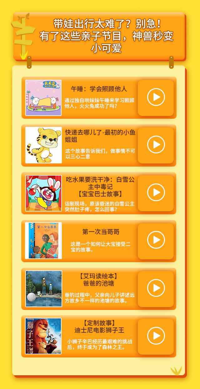 一家人出行在外,最烦什么?娃娃吵闹,针对这个痛点荔枝对带娃出行的用户,提供了亲子音频合集,包括《午睡:学会照顾他人》《快递去哪儿了-最初的小鱼姐姐》《吃水果要洗干净:白雪公主中毒记》《第一次当哥哥》《爸爸的池塘》《狮子王》等经典儿童故事,收好这份播单,带娃旅程变得轻松无忧。