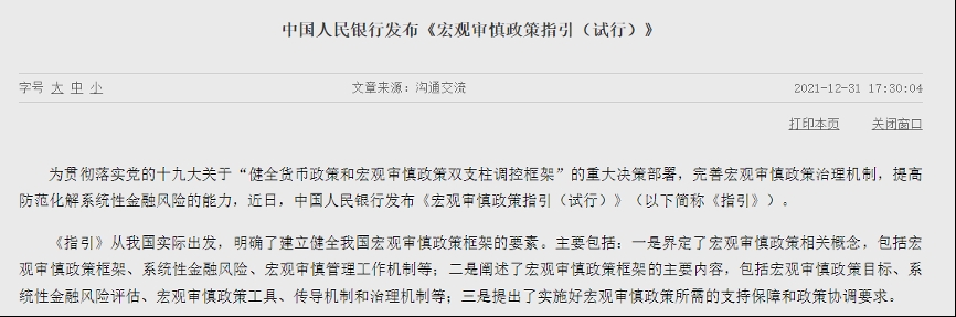 中国人民银行网站2021年12月31日消息,近日,人民银行发布《宏观审慎政策指引(试行)》。