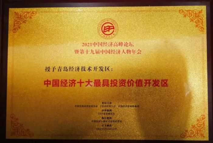 近日,青岛经济技术开发区在“2021中国经济高峰论坛暨第十九届中国经济人物年会”上获评“2021中国经济十大最具投资价值开发区”。