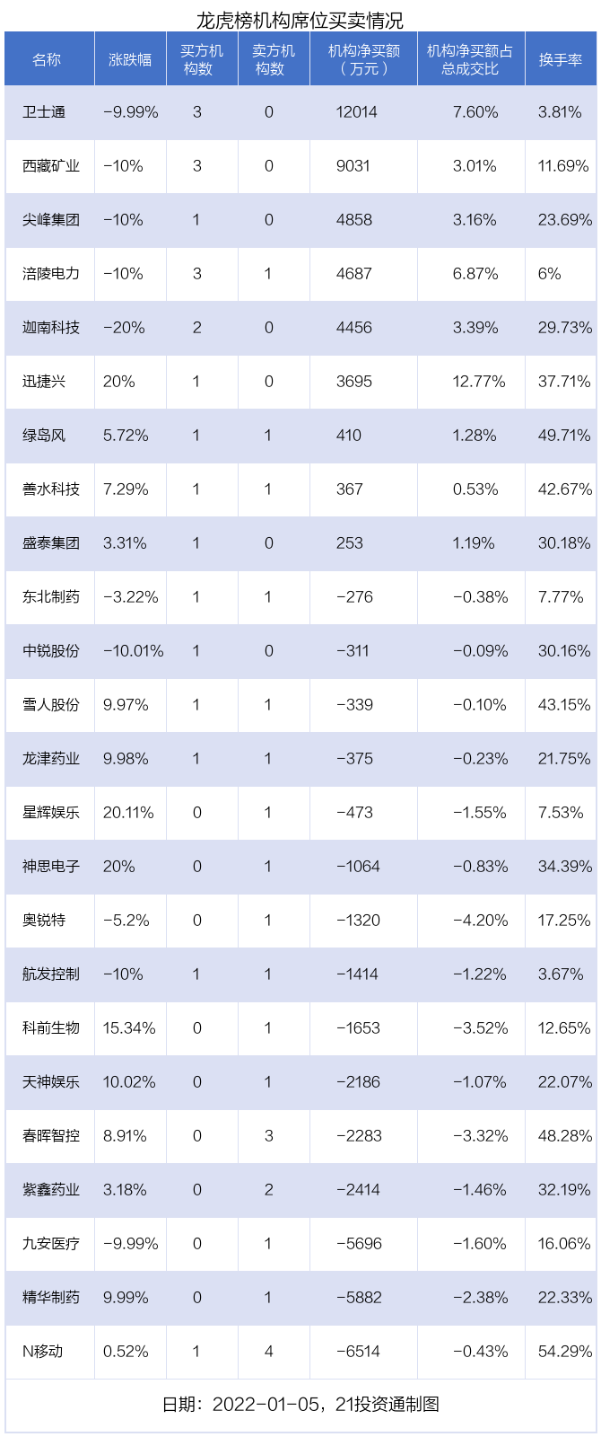 1月5日,24只个股龙虎榜出现了机构的身影,机构合计净买入7571.61万元。具体来看,机构净买入9股,净卖出15股。