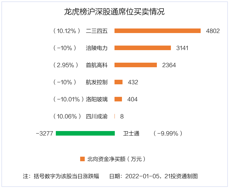 1月5日,北向资金参与龙虎榜中的个股共有7只,合计净买入7875.33万元。其中沪股通净买入3 股,合计净买入3553.1万元;深股通净买入3 股,净卖出1 股,合计净买入4322.23万元。