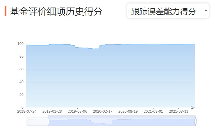 往下拉,我们还可以看到它各类指标的历史得分,还是以跟踪误差为例,除了19年下半年以及20年上半年做得并不好外,其余时间基本上都获得了99分以上的高分。