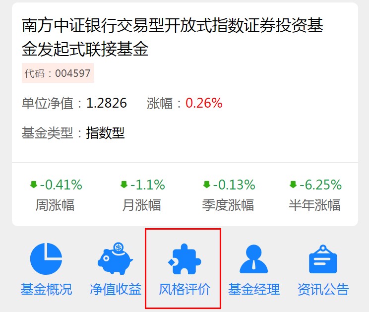 比如,我们选择这只“004597 南方银行ETF联接A”,在“风格评价”栏目中,我们就能看到基金通对于该基金的评价。