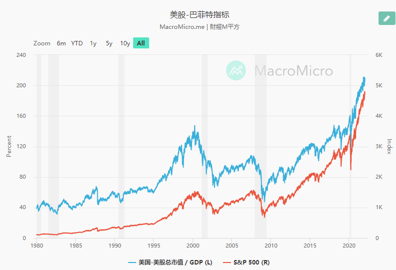 巴菲特青睐的市场指标本周攀升至211%的创纪录高位,再次为美国股市敲响了警钟,预示着崩盘可能即将到来。所谓「巴菲特指标」,是指美股总市值(48.99万亿美元)与美国GDP(23.20万亿美元)之比,巴菲特曾将这一指标形容为「任何时刻衡量估值水平的最佳单一指标」。威尔希尔5000总市场指数(Wilshire 5000 Total Market Index)周二触及48.99万亿美元的盘中新高,而美国去年第三季度GDP为23.20万亿美元,两者之比达到211%,远高于2020年第二季度的187%,当时美国疫情正全面爆发,GDP下降了约16%。