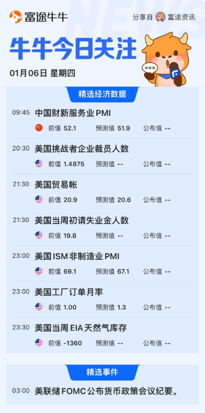 关键词:FOMC货币政策会议纪要,中国财新服务业PMI,初请失业金人数,美国工厂订单月率、11月贸易帐