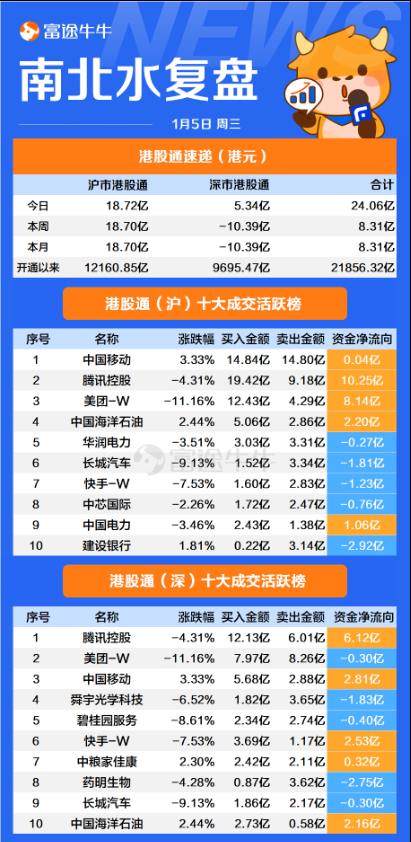 南向资金昨日净买入24.06亿港元。腾讯控股、美团-W、中国海洋石油分别获净买入16.36亿港元、7.84亿港元、4.36亿港元。建设银行净卖出额居首,金额为2.92亿港元。
