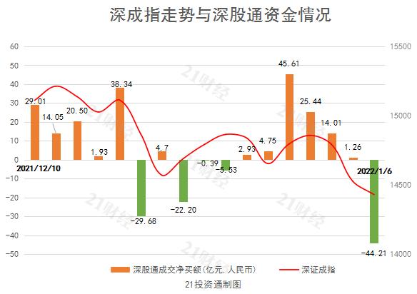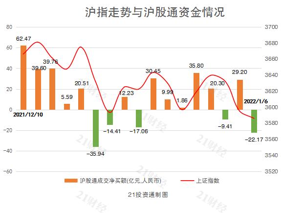 据21投资通(微信号ID:touzit21)智能监测, 北向资金全天呈现单边净流出态势,沪股通和深股通分别净卖出22.17亿元和44.21亿元,合计净卖出66.38亿元,创了2021年11月11日以来的最大单日流出净额,也终结了此前连续7日净流入的态势。