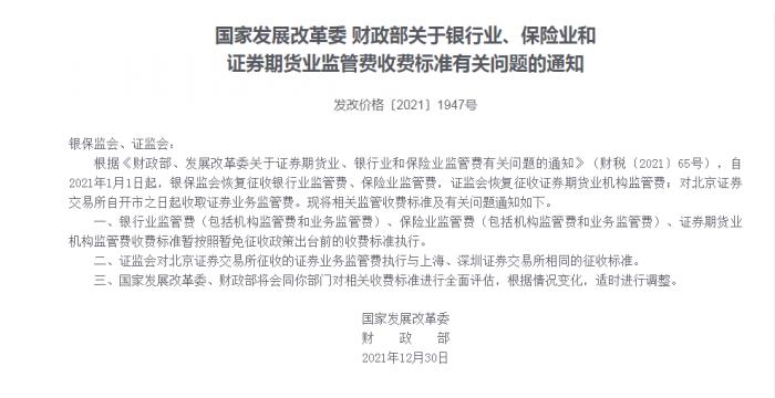 1月7日,发改委、财政部发布通知,自2021年1月1日起,银保监会恢复征收银行业监管费、保险业监管费,证监会恢复征收证券期货业机构监管费;对北京证券交易所自开市之日起收取证券业务监管费。银行业监管费(包括机构监管费和业务监管费)、保险业监管费(包括机构监管费和业务监管费)、证券期货业机构监管费收费标准暂按照暂免征收政策出台前的收费标准执行。证监会对北京证券交易所征收的证券业务监管费执行与上海、深圳证券交易所相同的征收标准。